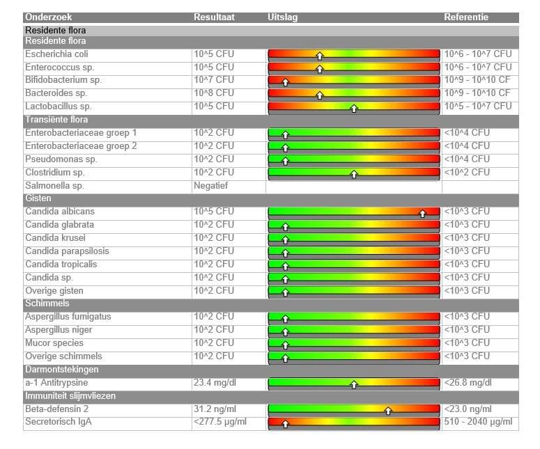 | Darmflora (Resident & Transiënt) | De balans tussen goede bacteriën en de aanwezigheid van ziekmakende bacteriën. |